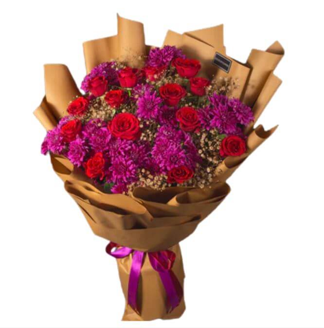 The Blossoms in Vogue Red Rose & Chrysanthemum Bouquet combines the bold beauty of red roses with the vibrant charm of purple chrysanthemums. This stunning bouquet is wrapped in kraft paper and tied with a magenta satin ribbon, making it a perfect gift for celebrating love, admiration, or any special occasion.
