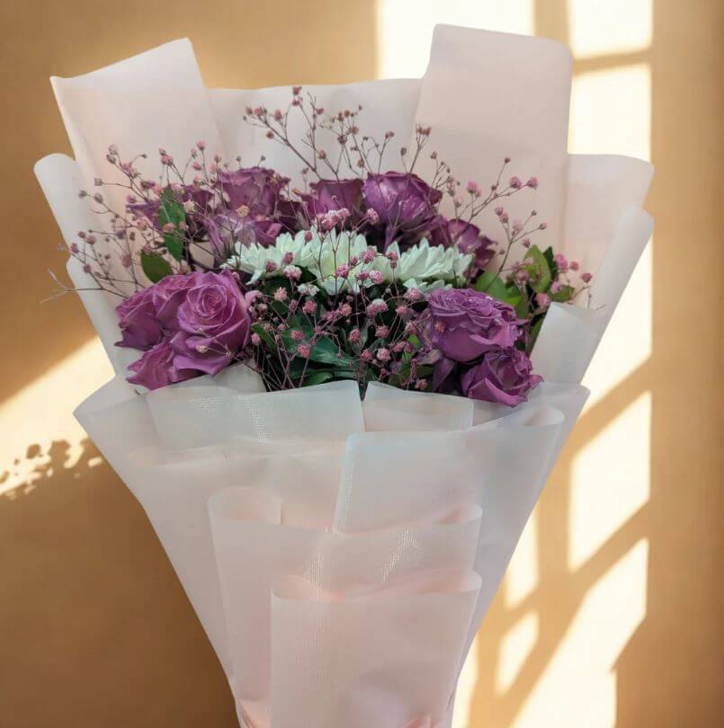 A bouquet that speaks of unwavering love — timeless, tender, and true. It features four opulent spray roses in rich purple, a single stem of pristine white chrysanthemum, and soft touches of gypso for delicate contrast. Wrapped in a plush pink sheet that beautifully enhances the colours within, this arrangement is elegance made visible. Thoughtfully composed and exquisitely packaged, it’s a tribute to love that never wavers — not even once in a thousand times.