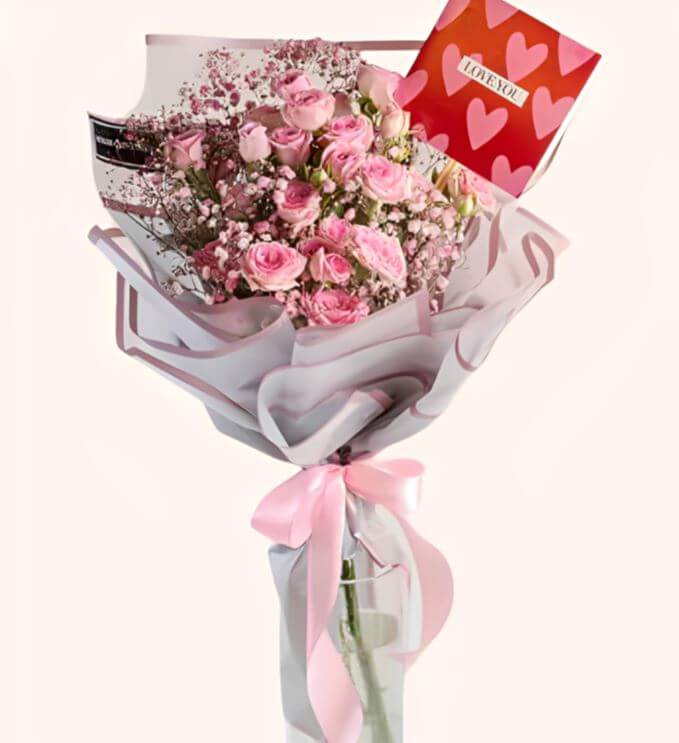 The Pink Rose Bouquet with Baby’s Breath and Love Card is a perfect blend of love and elegance. Featuring vibrant pink roses and delicate baby’s breath, this bouquet is wrapped in soft gray and pink paper and finished with a pink satin ribbon. Included is a “Love You” card to make your heartfelt message even more special. This bouquet is ideal for expressing love, appreciation, and affection on any occasion.