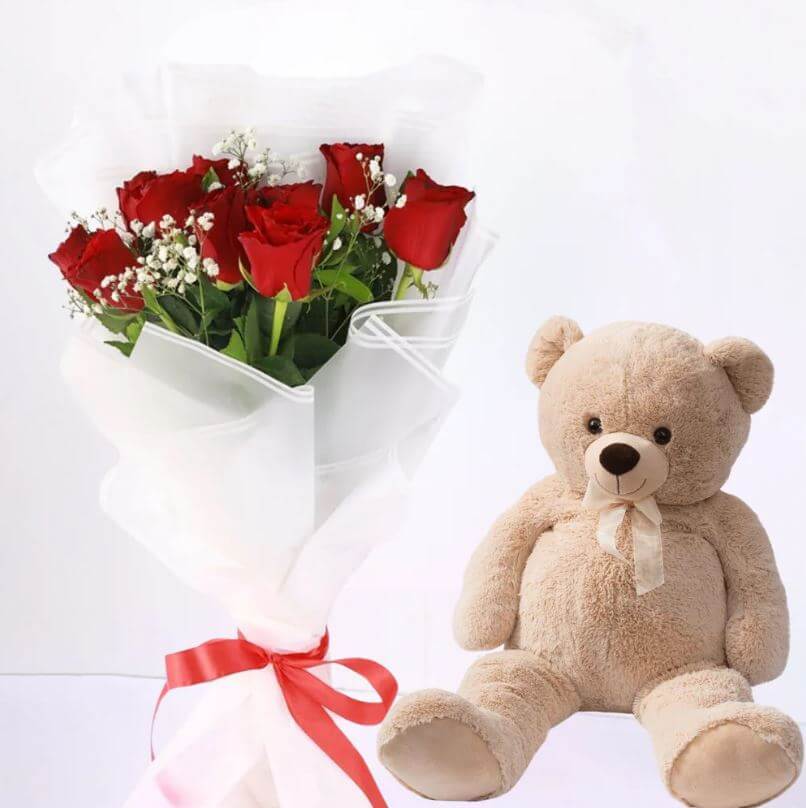 Teddy George’s Dream Roses” combines a bouquet of elegant red roses with a cuddly plush teddy bear, making it the perfect gift for any special occasion.Get ready for super soft hugs with this big, fluffy bear. This sweet and fluffy Snuggle Buddies pal is waiting for you with open arms. At a whopping 100cm tall, he is a giant compared to your usual cuddly toys! Theres no doubt hes too big for the washing machine, so its a good job George loves to be hand washed when his adventures get him a bit mucky. A perfect present for anyone who loves warm, fuzzy cuddles!