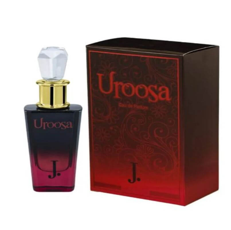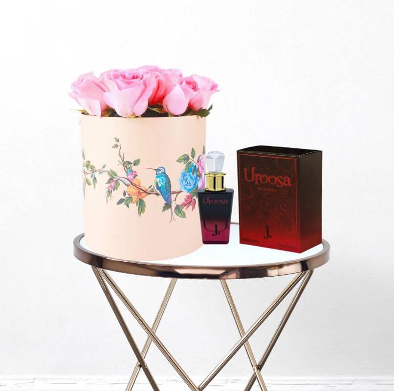 Experience elegance with Uroosa for Her by J. complemented by a box of imported/local pink roses. This sophisticated fragrance and luxurious floral gift are perfect for any special occasion.